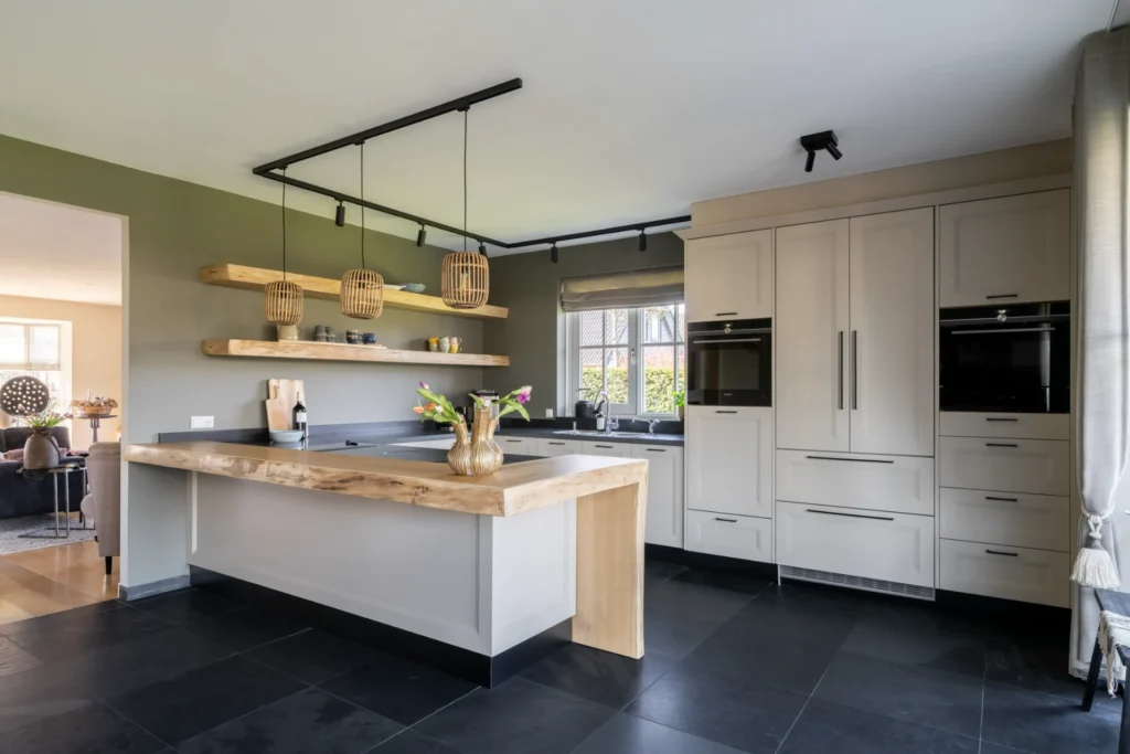 Landelijke keuken met robuust hout en klassieke fronten, gecombineerd tot een lichte leefkeuken.