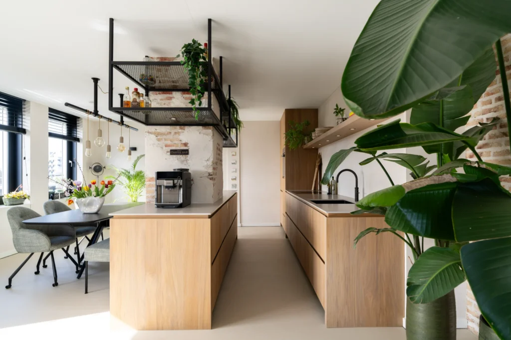Moderne keuken met warme houttinten en zwarte accenten voor een eigentijdse, sfeervolle uitstraling.