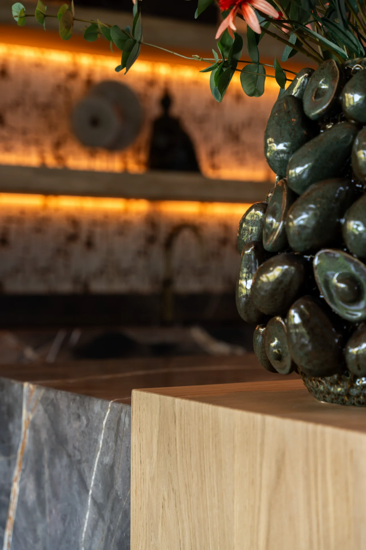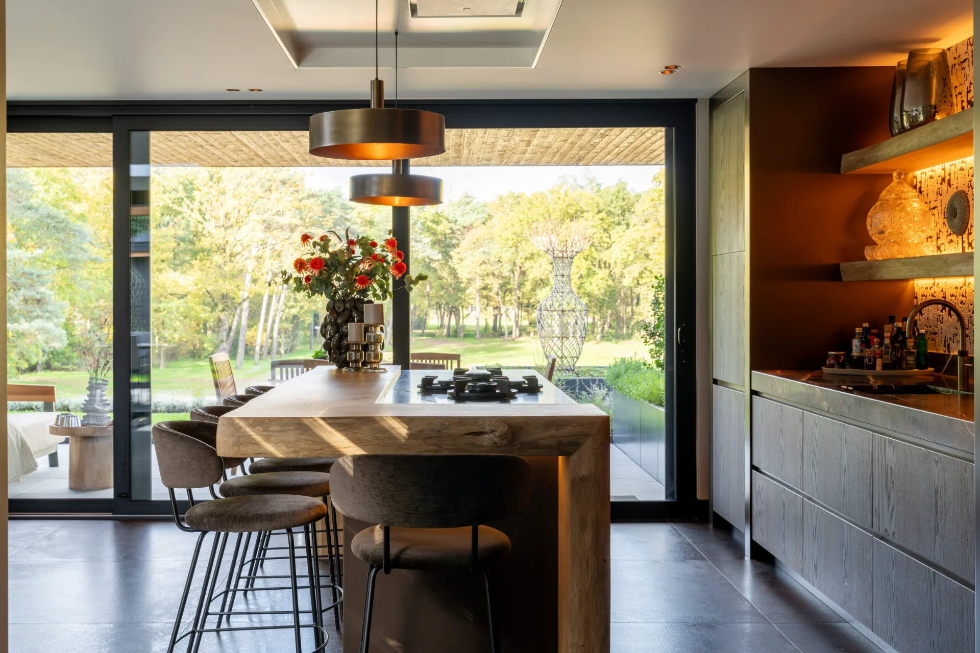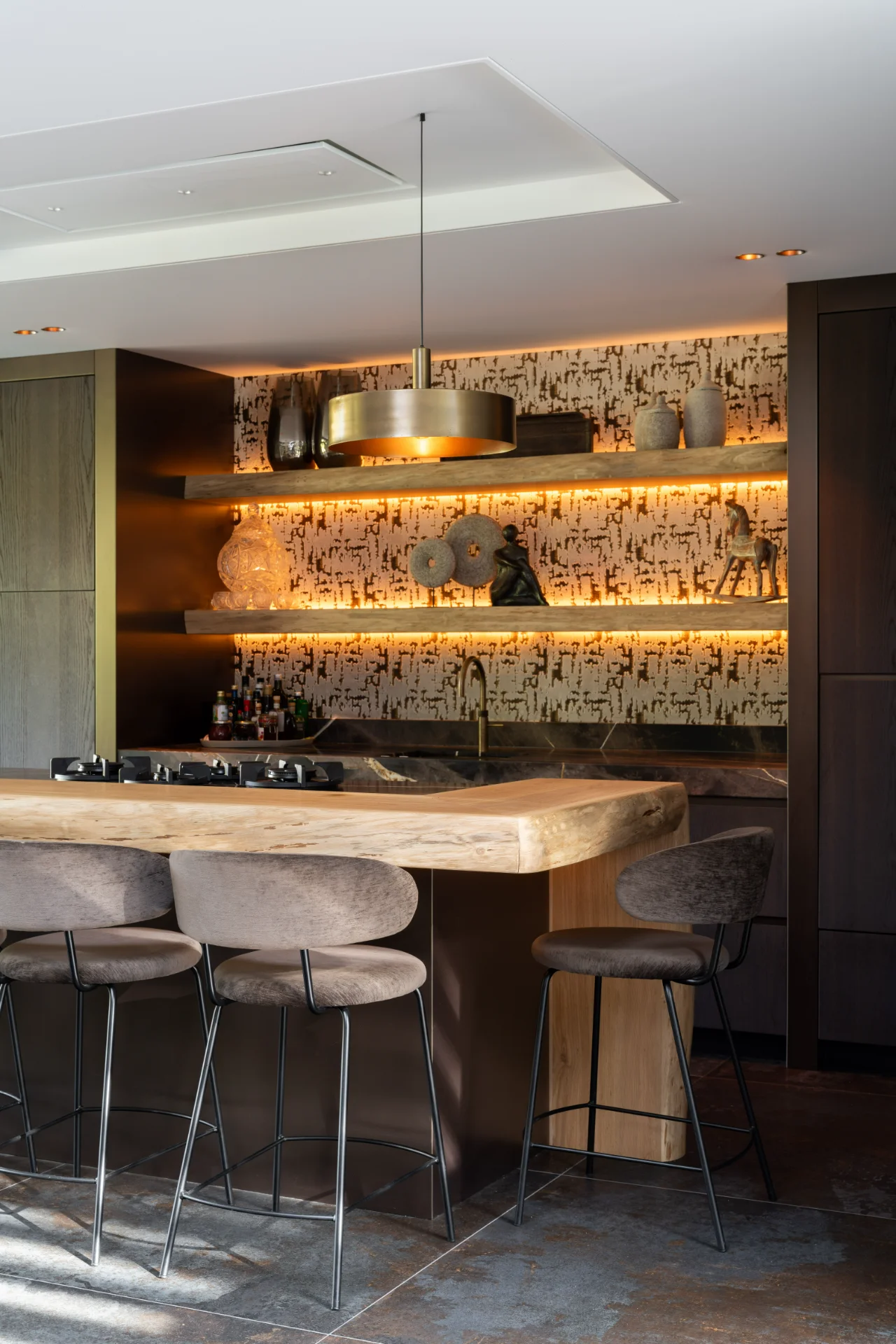 Materialen als warm hout, natuursteen zorgen voor een luxe, rustige basis. Open schappen met geïntegreerde verlichting geven diepte en benadrukken het verfijnde karakter van het ontwerp. De keuken is strak uitgevoerd, met slimme opbergruimte, greep loze fronten en hoogwaardige inbouw apparatuur. Dat volledig in lijn licht met de exclusieve uitstraling van deze woning.