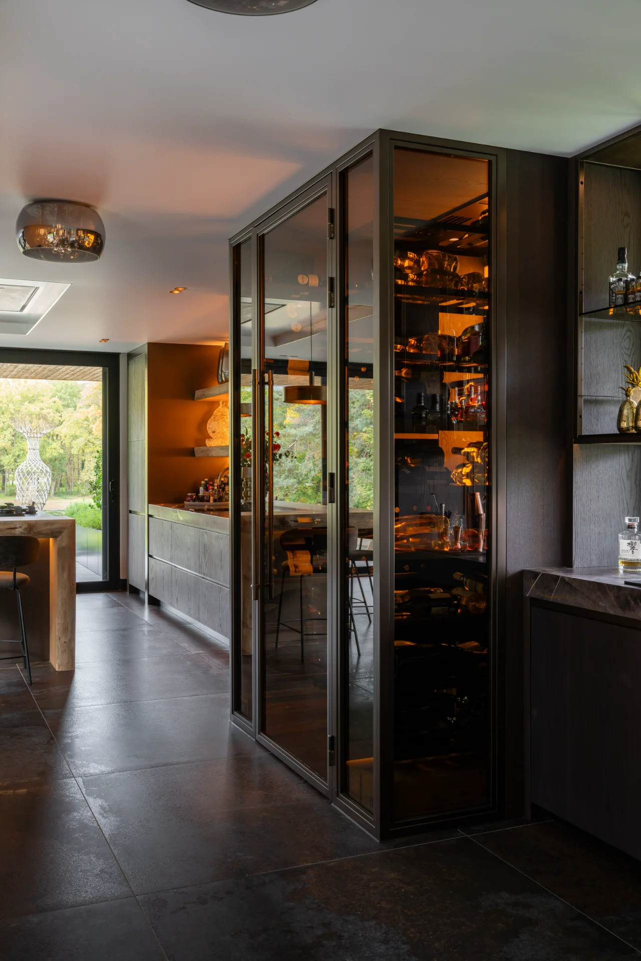 Het interieur is consequent doorgetrokken in materiaal gebruikt, kleurstelling en detaillering. Maatwerk kastenwanden en een geïntegreerde wijnkast maken de uitstraling sereen. Er is optimaal gebruik gemaakt van de ruimte.